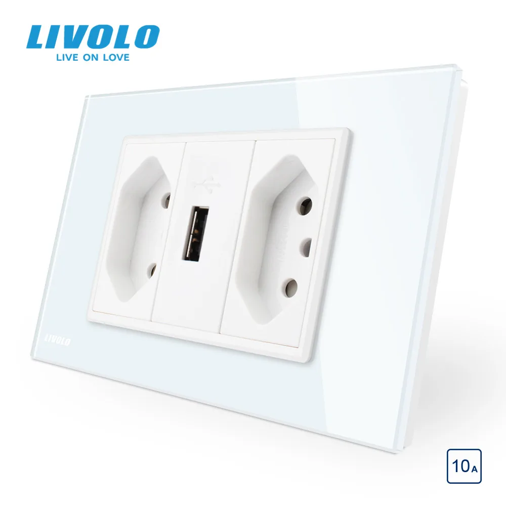 Livolo Brazilian Standard 3Pins 10A 20A with USB Socket, White/Black Glass panel for typn"n" plug,grounding wires