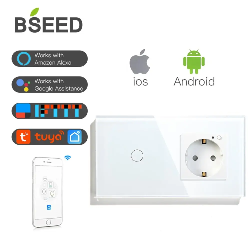 / WIFI Touch Light Switch Smart Wall Socket Google Alexa Smart Life APP Touch Screen Switch EU Power Socket White